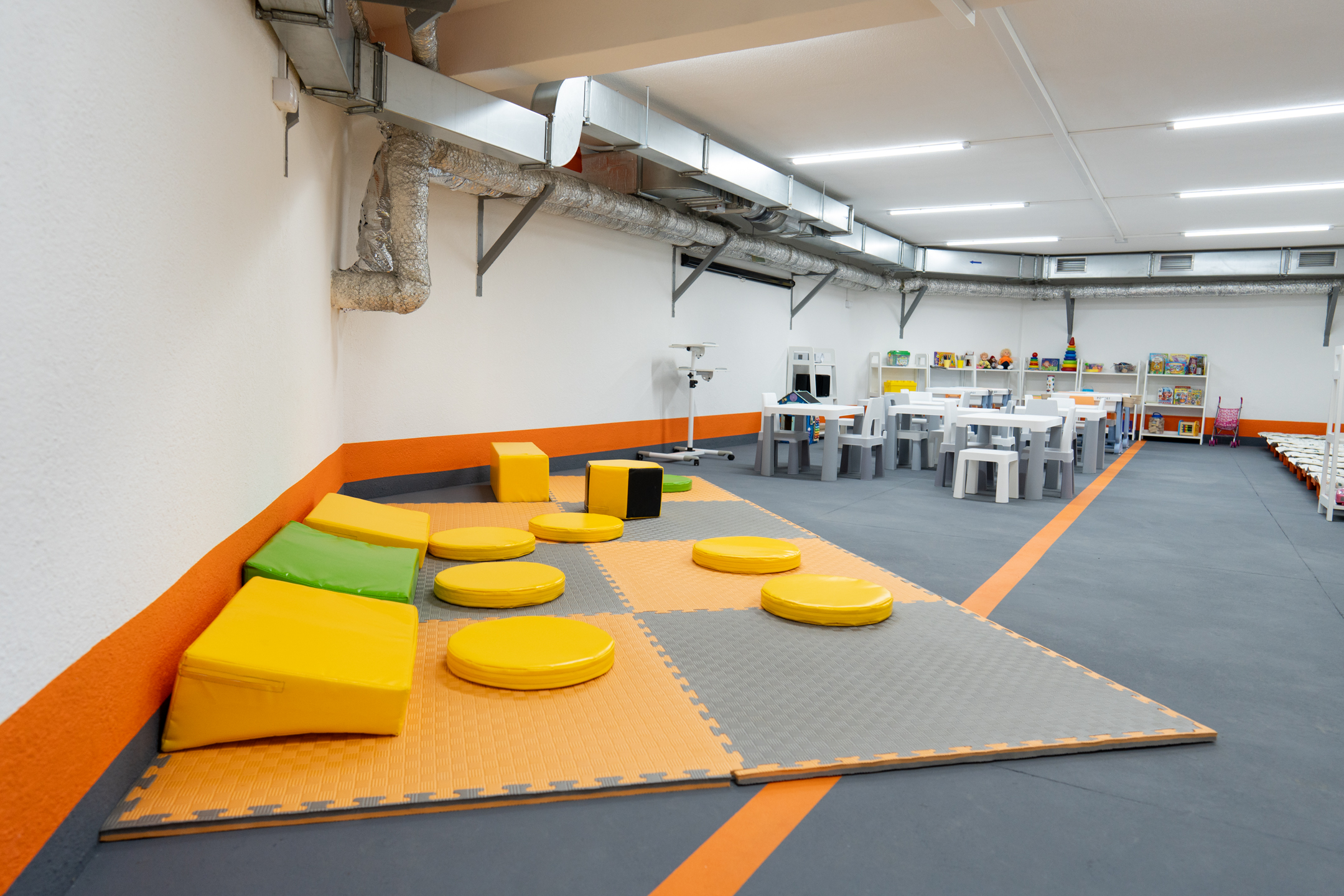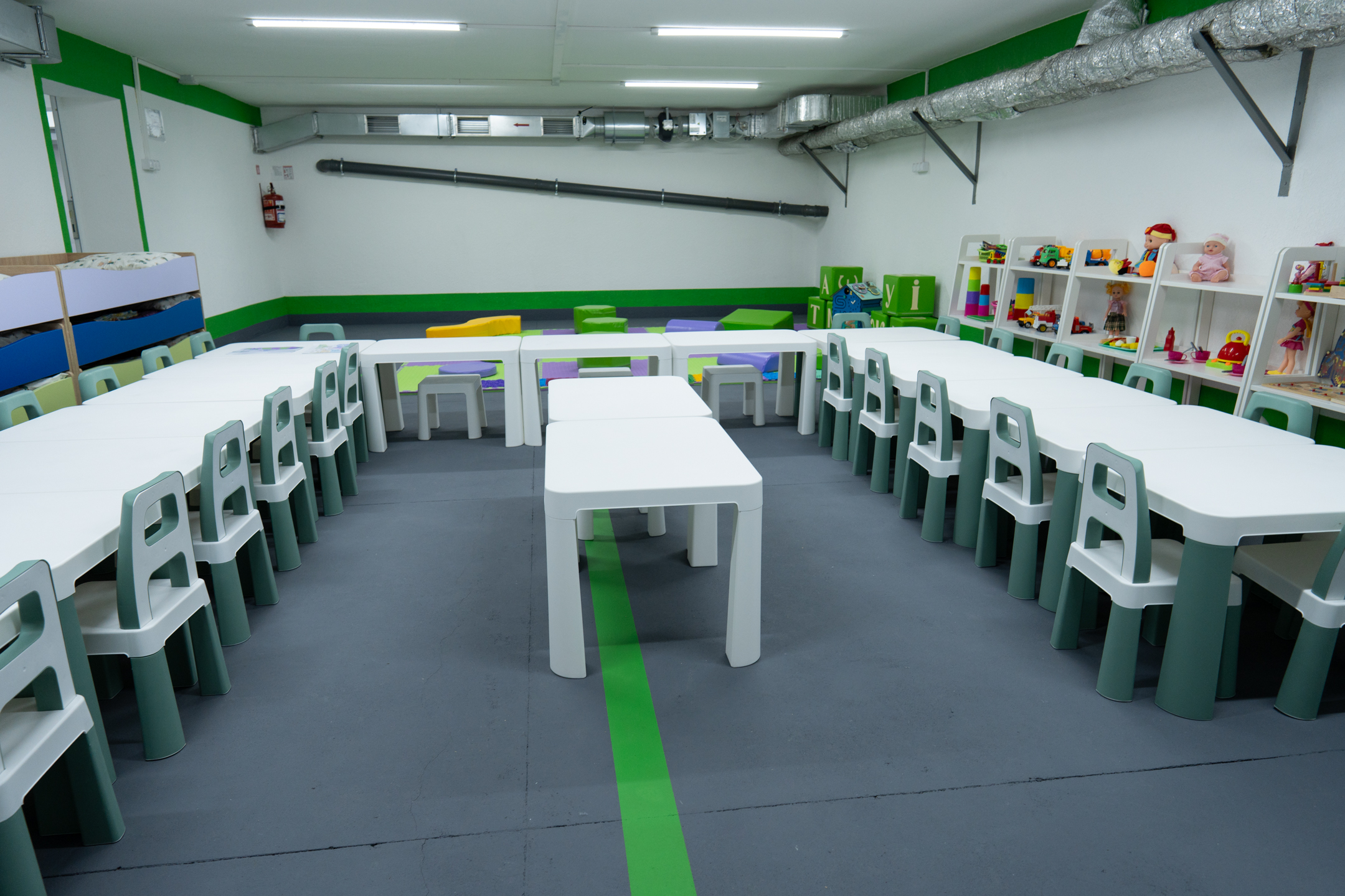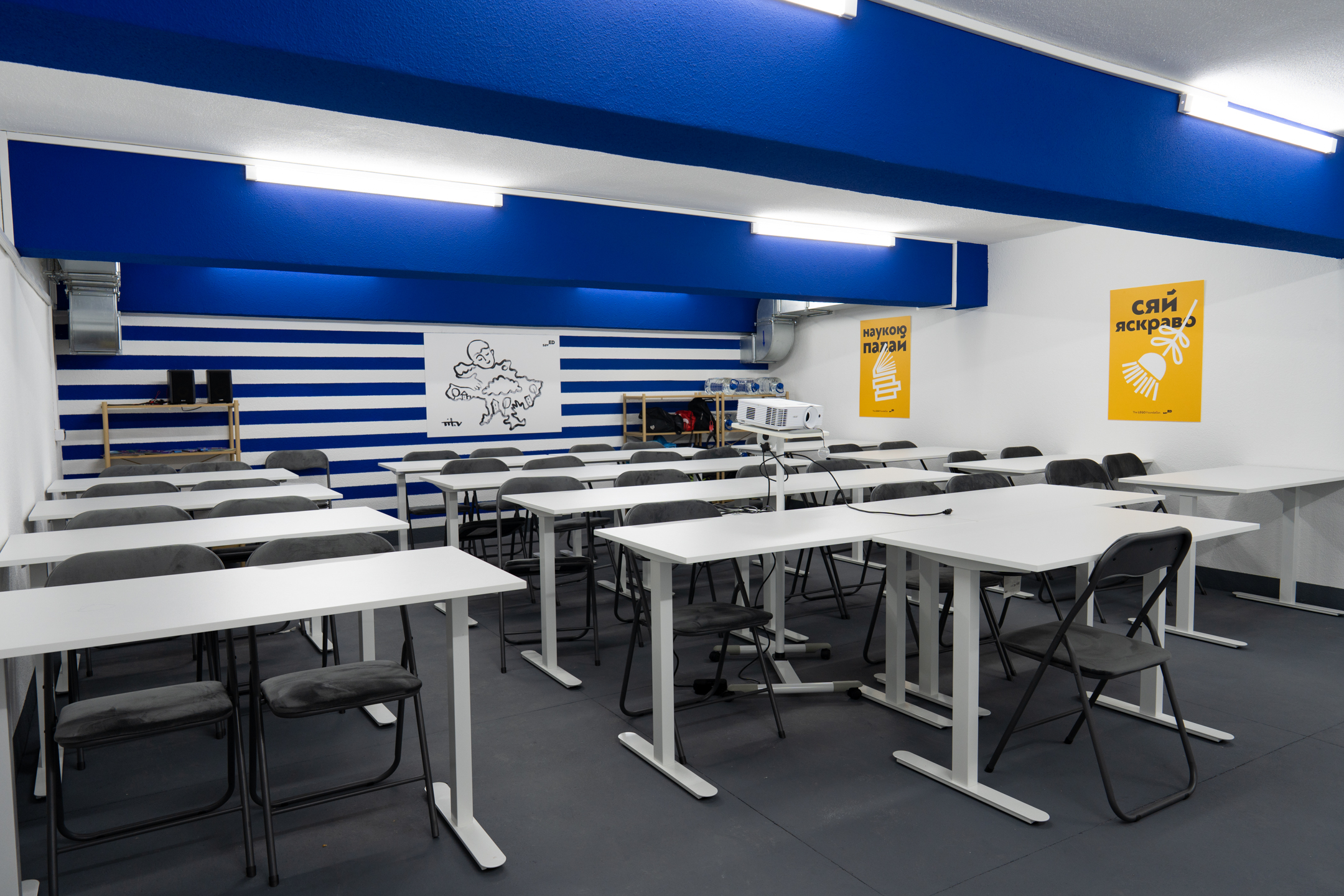 In the summer of 2025, with the support of the LEGO Foundation, we equipped three modern shelters in Mykolaiv. One of them became a unique shared space for both a preschool institution and a gymnasium. We transformed the basement into a fully functional educational environment, with learning zones for school students and play areas and rest beds for younger children.
